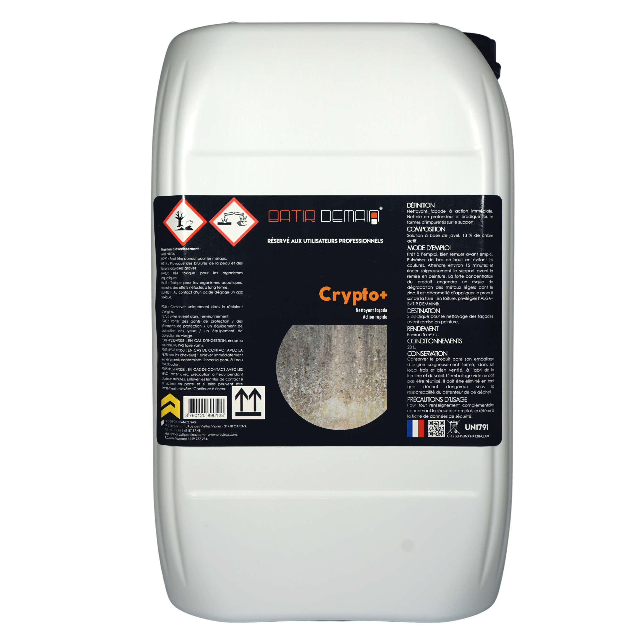 Crypto + est un nettoyant pour la décontamination des façades. Il éradique, assainit et neutralise les pollutions en façade avant la remise